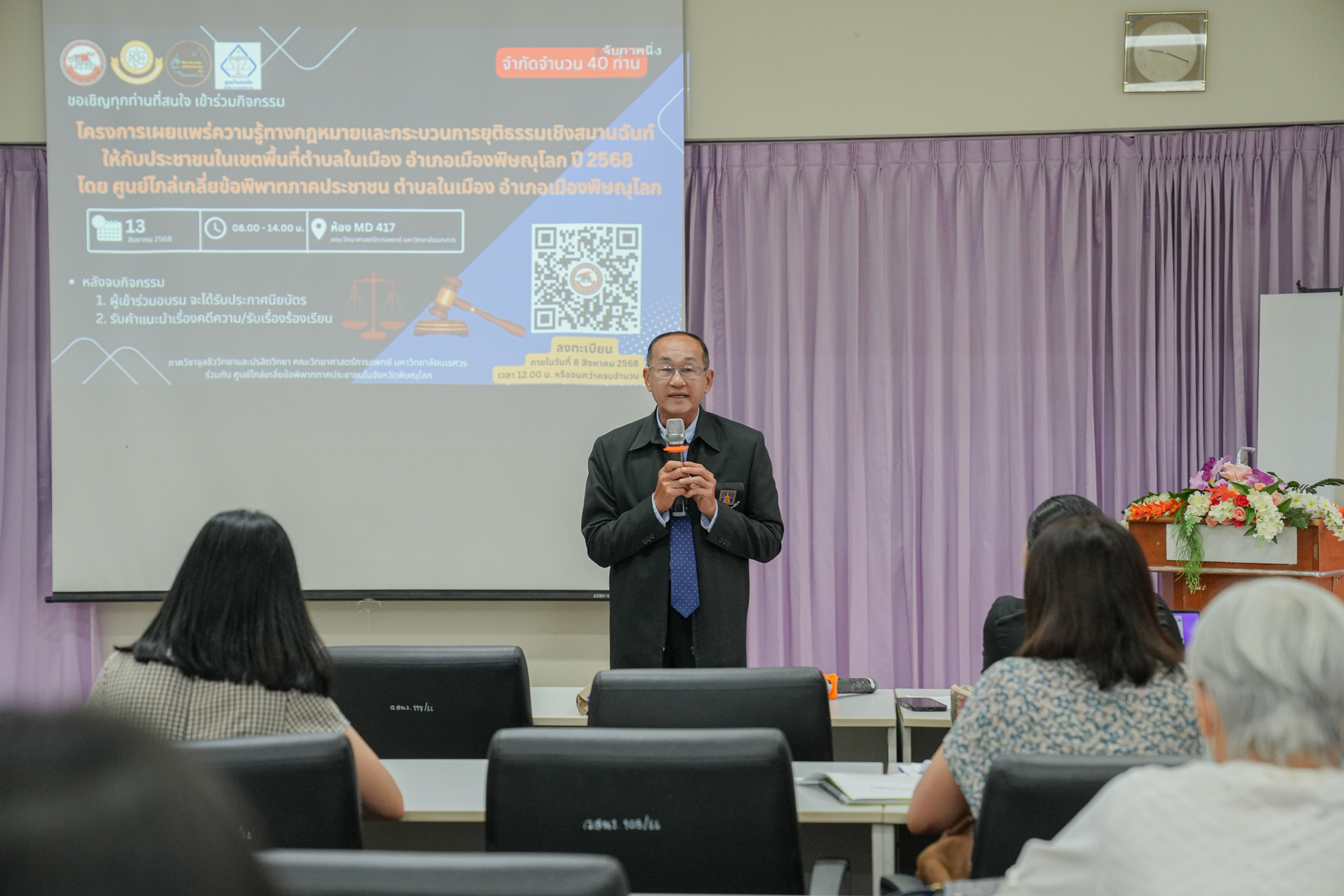 วันที่ 13 สิงหาคม 2568 ภาควิชาจุลชีววิทยาและปรสิตวิทยา คณะวิทยาศาสตร์การแพทย์ มหาวิทยาลัยนเรศวร ร่วมกับ ศูนย์ไกล่เกลี่ยข้อพิพาทภาคประชาชนในจังหวัดพิษณุโลก จัดโครงการเผยแพร่ความรู้ทางกฎหมายและกระบวนการยุติธรรมเชิงสมานฉันท์ให้กับประชาชนในเขตพื้นที่ตำบลในเมือง อำเภอเมืองพิษณุโลก ปี 2568 โดย ศูนย์ใกล่เกลี่ยข้อพิพาทภาคประชาชน ตำบลในเมือง อำเภอเมืองพิษณุโลก ณ ห้องประชุม MD 417 อาคารคณะวิทยาศาสตร์การแพทย์