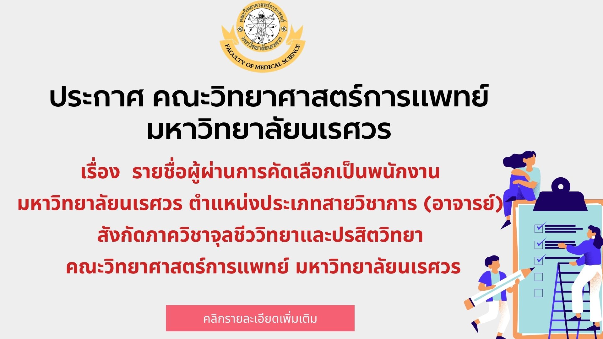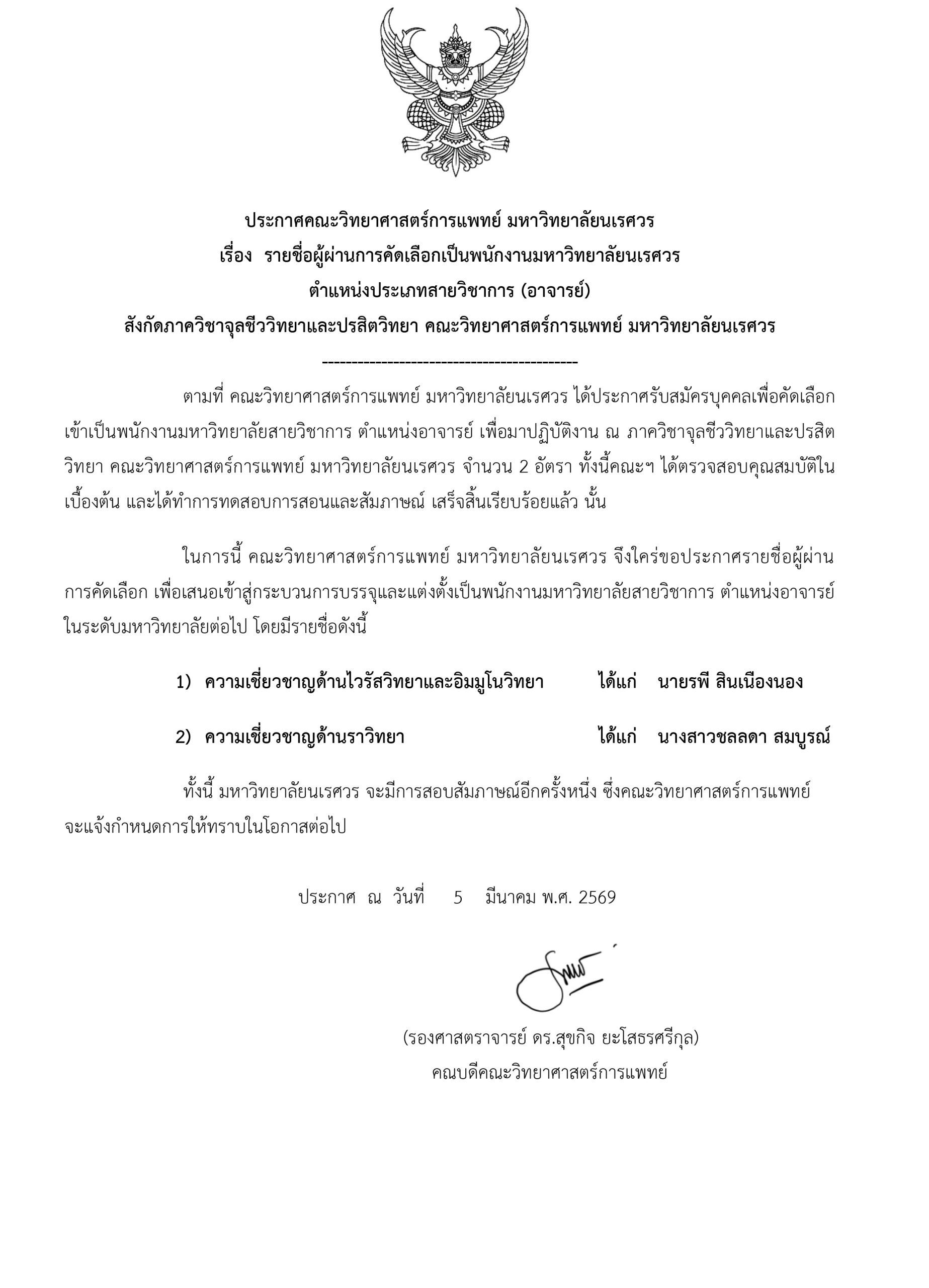 รายชื่อผู้ผ่านการคัดเลือกเป็นพนักงานมหาวิทยาลัยนเรศวร ตำแหน่งประเภทสายวิชาการ (อาจารย์) สังกัดภาควิชาจุลชีววิทยาและปรสิตวิทยา คณะวิทยาศาสตร์การแพทย์ มหาวิทยาลัยนเรศวร